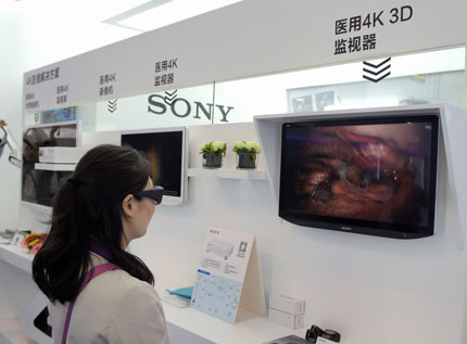 在4K影像解決方案展區,索尼利用4K術野攝像機MCC-S40MD、55英寸4K液晶監視器LMD-X550MC、4K錄像機HVO-4000MT、4K播放器PMW-PZ1等設備,組建起從信號采集、畫面監看,到信號傳輸、影像錄制的完整4K鏈條,從而為醫療用戶提供端到端的手術室4K解決方案。同時,利用純熟的IP傳輸技術及終端,4K畫面可通過光纖進行遠程轉播,遠端觀眾可輕松獲得手術室內的實時4K畫面和音頻內容。