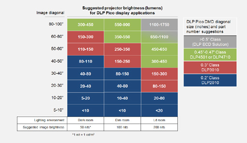 Pico芯片設計整機系統時,可以參考下圖1建議的投影機亮度值和相應的DLP芯片組。
