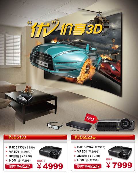 現在,優派3D家庭娛樂投影解決方案開展促銷,兩套方案均以震撼優惠價格開拓市場。方案中配備了VP3D1高清3D視頻處理器、3D眼鏡、以及HDMI線材。其中,采用PJD5133投影機的方案售價4999元,采用PJD5523w的方案售價7999元,非常值得期待。