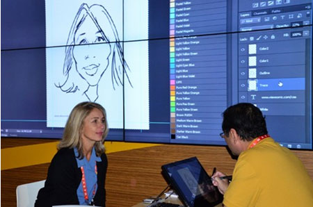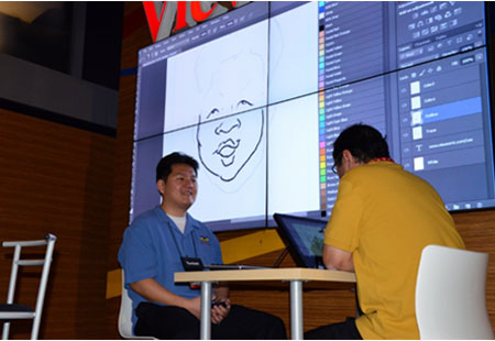 在現場,利用優派電磁觸摸顯示器PD1610,漫畫師不需要紙張也不需要繪圖板,直接在屏幕上實現神奇的“原筆跡”輸入效果,令前來親身體驗的參展人士驚訝不已。漫畫師以最直觀、真實流暢的手繪方式,將一張張真人的臉龐以漫畫風格,在優派PD1610上上輕松繪出,讓優派展臺呈現出截然不同的樂趣。