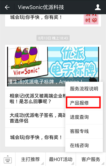 優派服務大升級的第一重驚喜,就是通過優派官方微信平臺報修產品,再也不必費周折地聯系電話客服,再也不用輸入螞蟻蝌蚪般的序列號。只要點擊優派官方微信平臺中的客戶服務下的產品保修,掃掃機器背后的序列號二維碼,即可自動填入序列號信息,大幅減少報修時間,讓產品報修從此輕松搞定。
