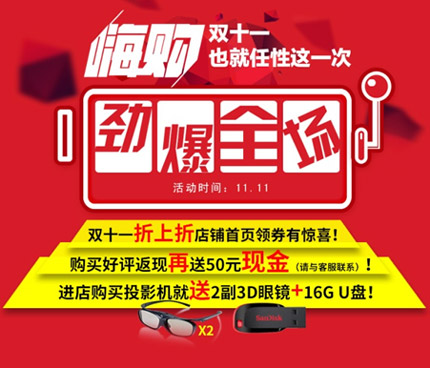 “雙十一”“嗨購”活動期間,各款經典款投影機“任性”超低價,更有三重厚禮相贈,驚喜不停。原價2299的優派3D高清商教投影機PJD5153,“雙十一”特惠價為2149,領優惠券減100,好評返現50,還送價值800元的兩副原裝3D眼鏡和價值50元的16G