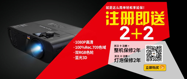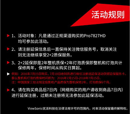 即日起凡正規渠道購買Pro7827HD產品,通過關注ViewSonic優派科技(ViewSonicCN)微信服務號進行簡單序列號相關信息注冊,即可享受2+2延保服務,即2年整機質保+2年燈泡質保的超值安心保障,且燈泡無使用時間限制。