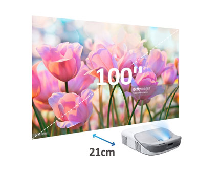 投射比僅0.223的超短焦鏡頭讓投影機的安裝更具有彈性。放在離墻面僅21公分的地方,即可投影出100吋的大視界。