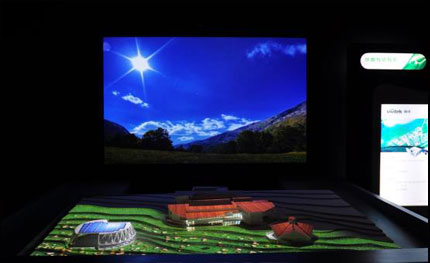 工作人員介紹,D795WT作為全球首款超短焦高清產品,可以在極短的距離內,投射顏色炫目的高清畫面,所以它在此案例中承擔了投射背景的功能。而高性能工程機D5000則施展了自身絕佳性能,將顏色灰暗的建筑模型變為了城市中的體育館、休閑場所、民宅等。