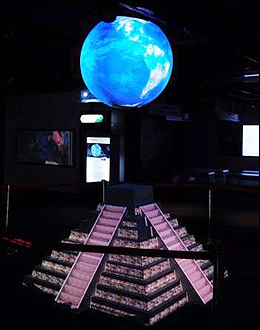其次,4臺D6510和4臺D5000帶來震撼的組合投影方案,模擬地球外形,描述瑪雅金字塔和歷法的故事。4臺D6510應用外球幕投影技術,模擬地球的外形,表現地球周期變化。而4臺D5000則承載了外墻投影方案,模擬瑪雅金字塔。兩個型號的工程投影機合作默契,演繹了一場宇宙大爆炸的精彩好戲。這樣創意十足的組合投影方案,讓現場媒體朋友眼前一亮,紛紛拿出相機留影,并且不少人還感嘆,組合投影方案是自己頭一次見到,效果十分震撼。