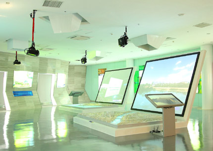 數字沙盤展示區所采用的Vivitek(麗訊)D6510工程投影機曾打造過上海地產集團展廳等眾多成功案例,它采用280W雙燈系統,亮度可達6500流明,對比度為3000:1,物理分辨率XGA(1024×768)級別,最高支持WUXGA