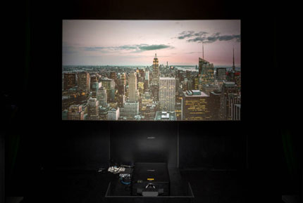 投影機(jī)作為大屏顯示的優(yōu)勢(shì)在于“想要多大有多大”,拼融在工程機(jī)應(yīng)用領(lǐng)域是最常用最常見的解決方案。Vivitek(麗訊)用4臺(tái)10000LM激光投影機(jī)通過拼接融合,形成了接近300吋的超大幅畫面。值得一提的是,由于采用了前面及側(cè)面進(jìn)風(fēng),尾部出風(fēng)的設(shè)計(jì),智能風(fēng)扇模式配備了傳感器,可自動(dòng)檢測(cè)投影機(jī)的安裝方向,并具有高海拔模式,使得散熱更容易實(shí)現(xiàn),因此投影機(jī)的安裝和傾斜角度不在不再有任何限制。于是我們看到的這個(gè)解決方案,投影機(jī)全部側(cè)面90度安裝,大大降低了安裝時(shí)空間的限制。