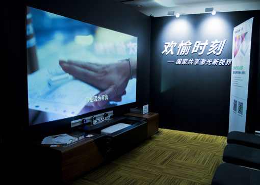 “歡愉時(shí)刻”主要以超短焦家庭影院為主,這里的主角是Vivitek(麗訊)超短焦激光投影機(jī)DH765Z-UST。它采用了使用壽命長達(dá)20000小時(shí)以上的激光光源,擁有0.233:1超短焦投射比,54厘米的距離即可投射出100寸超大畫面,放置于電視柜上即可使用,為空間有限的家庭用戶提供了理想選擇。性能方面,DH765Z-UST擁有4000流明亮度、30000:1高對(duì)比度、支持1080P原始分辨率和全格式3D,符合Rec.709色域標(biāo)準(zhǔn),提供逼真的色彩還原,在客廳中便可輕易實(shí)現(xiàn)震撼的影院級(jí)效果。