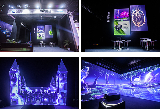 本次2018年成都國際音樂(演藝)設施設備博覽會,Vivitek(麗訊)最具“重量級”的當屬序廳多屏聯動展項,此展項采用2塊150寸立幕,通過強大的播控系統和2臺10,000流明激光工程投影機DU8190Z投射出色彩絢麗的風景畫面,為用戶展示高清細膩的視頻畫面和單屏、多屏、異形拼接的多種播放模式。序廳多屏聯動展項充分利用了Vivitek(麗訊)DU8190Z激光投影機720度多角度安裝的特點,結合可選配8款電動鏡頭,可以更加靈活選擇安裝位置,最遠投影距離可達100米。這種序廳多屏聯動多適用于舞臺演出、宴會廳、企業/政府展廳、規劃館/博物館,以及大型廣告屏等。