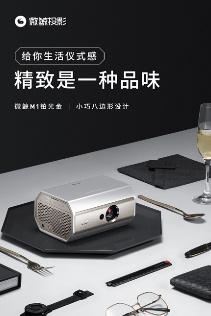 除了視覺盛宴的體驗,微鯨投影M1本身也秀色可餐,充滿著藝術般的精致,“斯堪的納維亞風格”獨特設計,幾何八邊形點綴著優雅的鉑光金,內角和1080度的腔調,將現代主義設計思想與傳統設計文化完美結合,既注意四面八方多角度投影的實用功能,又強調生活美學。八面玲瓏的奪目外觀,每一面都用了大面積噴砂工藝處理的純金屬材質,同時也寓意了“面面俱到”的豐富功能,繪聲繪色才是生活的真諦。賞心悅目的模樣將生活的儀式感展現地淋漓盡致。