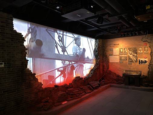 上海八一三淞滬會戰,是抗戰時間規模最大、死傷最慘烈的戰爭之一,以“牢記歷史不忘英烈”為初心,博物館將兩次淞滬戰爭留下的珍貴影像資料剪輯為影片播放,讓我們在今天還有幸見到當時的真實戰爭場景。兩面墻體共使用五臺明基激光工程投影機打造融合畫面,還在墻面處理上模擬成當時斷壁頹垣的真實環境,更富有臨場感,宛如身處其中,周遭全是歷史硝煙。