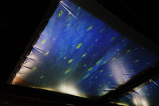 梵高描繪的荷塘亦如星空一樣璀璨,在獨特的鏡子房間中,空間無限延展,投影畫面位于屋頂,經由四面墻壁與地板的鏡面反射,我們仿佛置身湖水中央。兩臺BenQ短焦投影機吊頂安裝,垂直將畫面呈現在背投屏幕上,觀眾們不見光線而被影像所環繞。