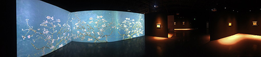 法國南部阿爾勒地區是梵高生活的地方,這里的自然風光成為他的創作源泉,特別是麥田澎湃的景象,在他很多作品中出現。4臺BenQ工程投影機SU765分別在兩側拼融投影大畫面,將《豐收在普羅旺斯》等作品中強烈的色彩、明亮的色調完美呈現;而且在畫面前方還特別擺放了麥穗,觀眾仿佛面對大片麥田,獲得更真實體驗。