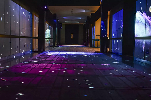 此次驚艷眾人的沉浸式星空投影由14臺愛普生高亮激光投影機打造,以25米長的長廊為布景,長廊幽深,墻壁與地面光影相交映,輕松創造了沉浸式場景,為賓客帶來了夢幻、奇妙的星空體驗之旅。