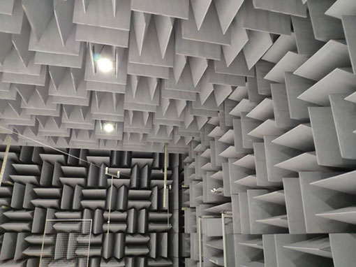 在鋪設隔音裝置的實驗室中,以專業的噪音儀,測試投影機不同方位在滿功率運行時所產生的噪音值。