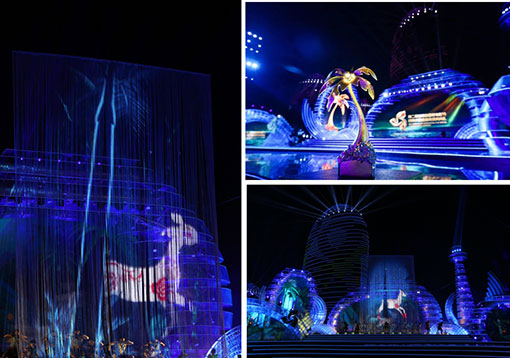 投影疊加實現(xiàn)16萬流明高亮度,在舞臺中央架設(shè)起的20m*10m雨絲幕上營造出夢幻影像。