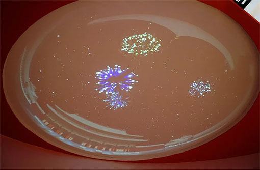 “萬壽盛典,普天同慶”展項是一臺ZU1050投影穹頂星空,通過iPad可以觸發各種煙花綻放于夜空,靈動的交互體驗令人印象深刻。