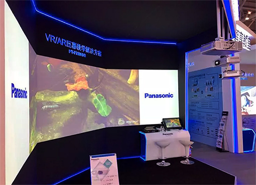 利用3臺PT-FX600C投影機組成的VR/AR巨幕教學解決方案,為參觀者展示多類別的虛擬仿真教學實驗室內容,逼真再現生物、物理、機械、醫學等相關課程,使教學中的老師及同學獲得前所未有的立體視覺體驗。