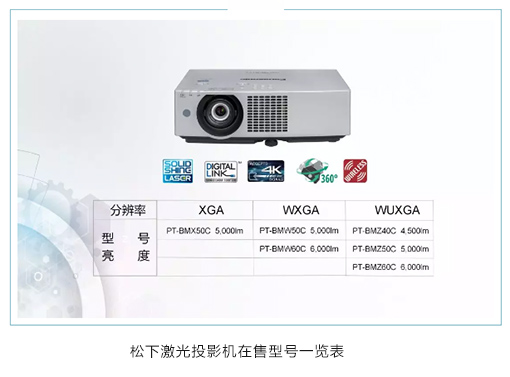 今年6月份松下推出的激光投影機PT-BMZ60C、PT-BMW60C兩款新機型,亮度高達6000流明,基本可以滿足部分工程項目的使用需求。松下激光投影機光源壽命長達20000小時,亮度4500lm-6000lm,動態對比度3,000,000