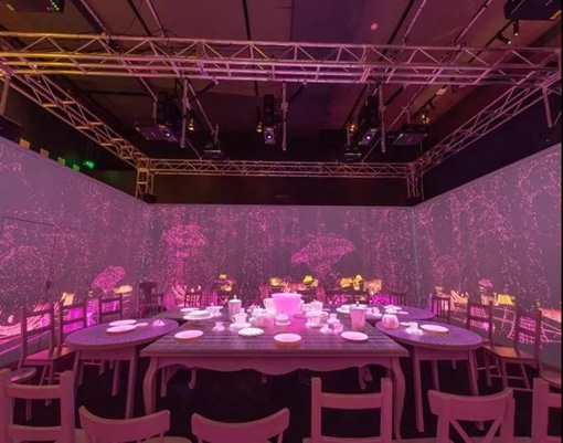 身臨其境的瘋帽子茶話會(huì)體驗(yàn):在7m×14m的純白色房間內(nèi),實(shí)現(xiàn)沉浸式實(shí)物投影,投影面覆蓋桌子表面以及從地板到天花板的所有墻壁。